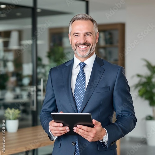 Smiling businessman holding tablet in modern office
