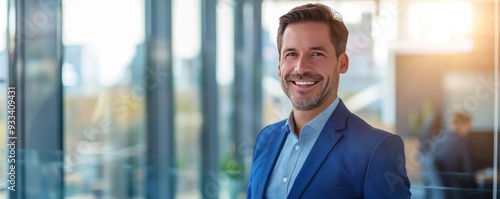 Smiling businessman in a blue suit, standing against a blurred modern office interior with cityscape view, close-up portrait with copy space on the right.