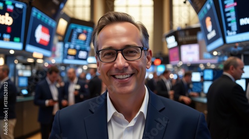 Smiling businessman in a bustling stock exchange, surrounded by vibrant screens displaying market data. He exudes confidence and success, a symbol of financial prowess.