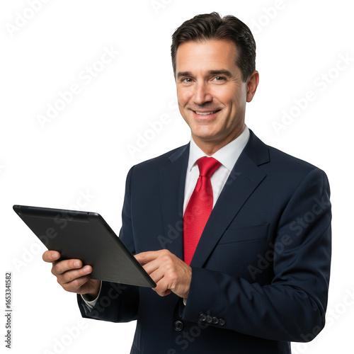 Smiling businessman in a dark suit and red tie holding a tablet computer and looking at the camera isolated on transparent background