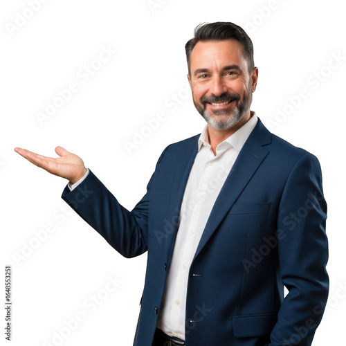Smiling businessman in a suit presenting with his hand isolated on transparent background