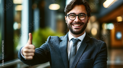 Smiling businessman in glasses and suit giving a thumbs up in a modern office setting