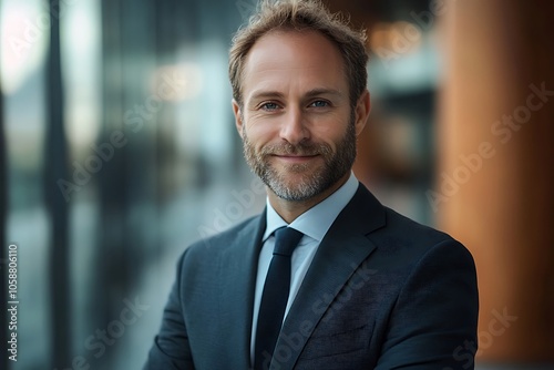 Smiling Businessman in Modern Navy Blue Suit with Tie