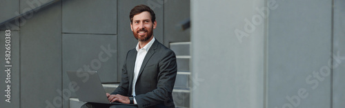 Smiling businessman in suit working laptop sitting on stairs near office and looking at side