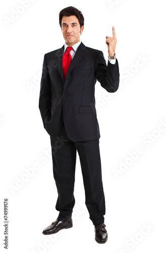 Smiling businessman pointing his finger up