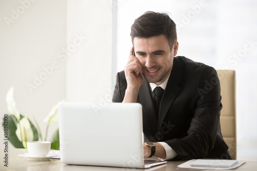 Smiling businessman talking on cellphone sitting at office desk in front of laptop, having successful mobile negotiations with client, manager consulting customer by phone, easy internet banking