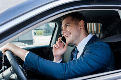 Smiling businessman talking on smartphone while driving car on blurred foreground.