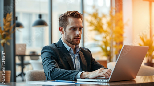 Smiling businessman working on laptop in modern office space. Young student using computer remote studying, watching online webinar, zoom virtual training on video call meeting
