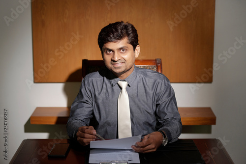 Smiling businessman working with documents