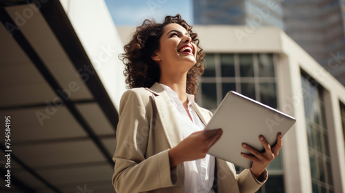 Smiling businesswoman holding a tablet while standing outdoors in front of modern office building in a sunny day.