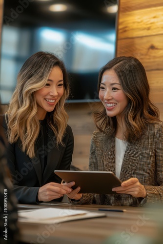 Smiling businesswoman in professional attire holding a digital tablet at the office desk