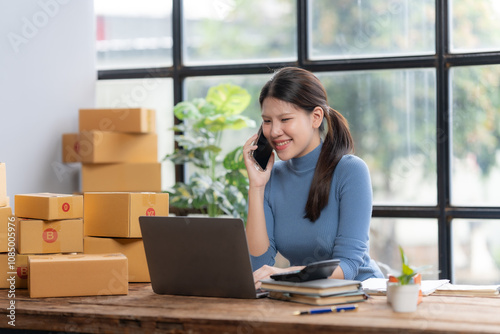 Smiling Businesswoman Taking Orders: An Asian businesswoman, in a blue sweater, smiles warmly while talking on the phone, surrounded by cardboard boxes, a laptop, and a houseplant.