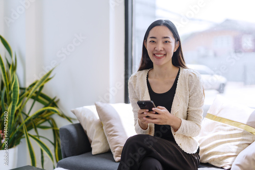 Smiling businesswoman using mobile phone while sitting on comfortable sofa in modern office space