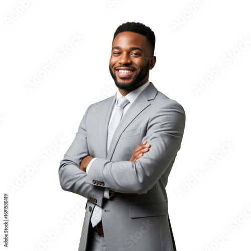 smiling businesswoman, wearing a modern business style, enthusiastically crossed arms, smiling, isolated on a white background