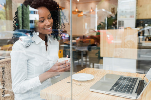 Smiling businesswoman with coffee cup looking at laptop while sitting in cafe