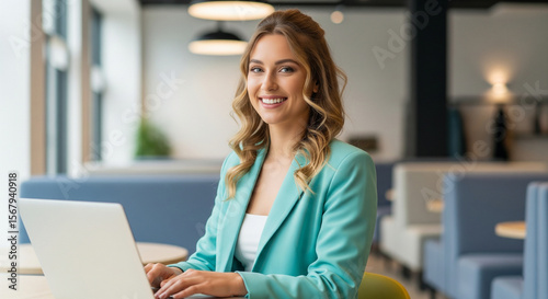 Smiling businesswoman working on a laptop in a modern office or co-working space