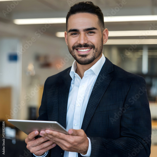 Smiling busy young Latin business man manager using tablet computer, happy Hispanic businessman executive looking at camera holding tab working standing in office. Portrait.