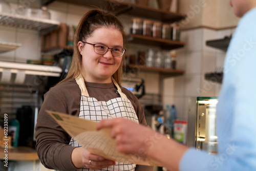 Smiling cafe owner with down syndrome helping customer at coffee shop