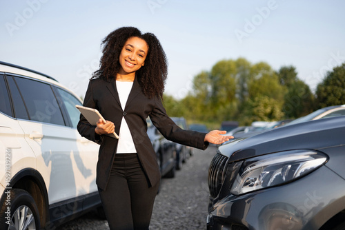 Smiling car salesperson presenting a vehicle on a sunny day. The woman holds a tablet and gestures towards the car.