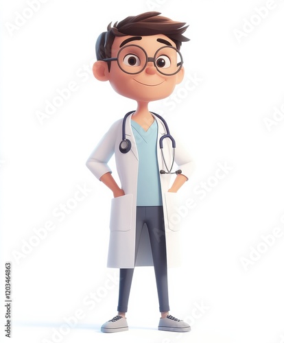 Smiling Cartoon Doctor Character with Stethoscope Standing Confidently, 3D
