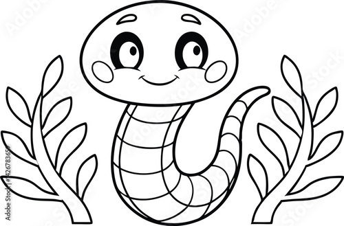 Smiling Cartoon Snake with Vines Outlines, Friendly Reptile, Animal