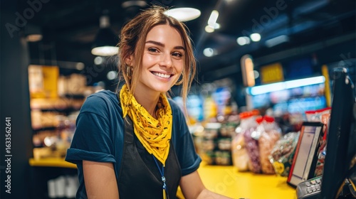 Smiling cashier quickly scanning products at a modern convenience store counter, bright lights and shelves stocked behind, friendly service,