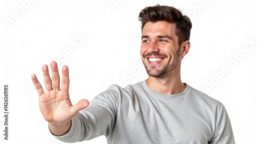 smiling caucasian man in gray shirt holding hand up in welcoming gesture, showing five fingers. positive expression, friendly interaction. website design on white background