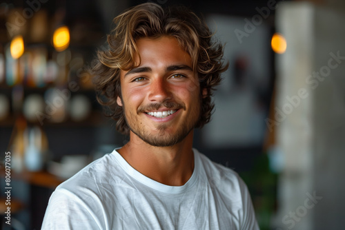 Smiling Caucasian man in white t-shirt with curly hair in living room interior