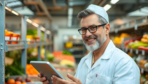 Smiling Caucasian senior adult inspector dressed in white uniform using tablet for quality assessment of food in food plant isolated with white highlights, png