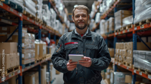 smiling Caucasian warehouse or logistics center employee in uniform with a tablet computer in his hands looking at the camera against the background of shelves with boxes