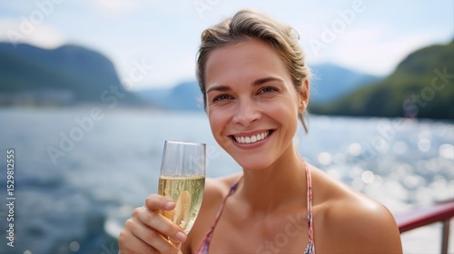 Smiling caucasian young female enjoying champagne outdoors by scenic lake