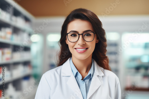 Smiling cheerful confident pharmacist in drugstore store shop Generative AI