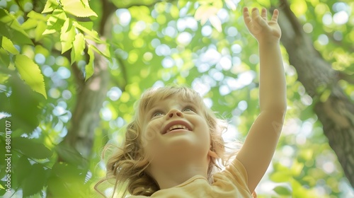 Smiling Child Reaching Upwards Amidst Towering Tree Canopy,Symbolizing and Connection to Nature