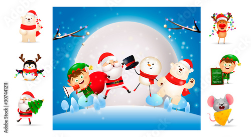 Smiling Christmas cartoon characters jumping outdoors. Can be used for invitation and greeting card. New Year concept