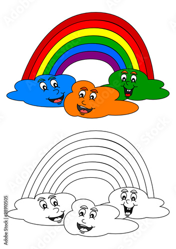 Smiling colored clouds with a rainbow of color as a coloring book for young children - vector svg