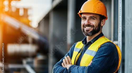 Smiling Construction Worker in Safety Gear at a Building Site During Sunset, Showcasing Professionalism and Safety Awareness in Industrial Environment