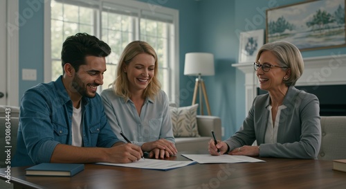 Smiling couple finalizing their home purchase with a real estate agent, symbolizing homeownership and financial stability