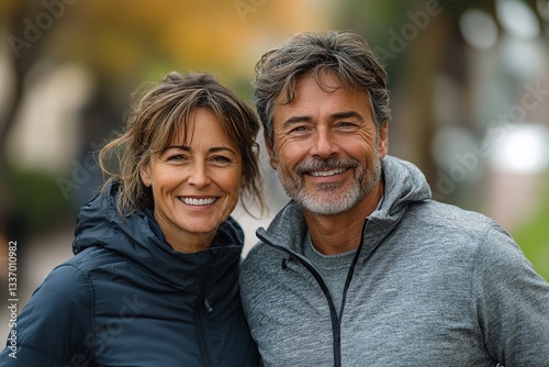 Smiling couple poses outdoors. The woman wears a dark jacket, and the man wears a gray hoodie. Both are happy and look healthy.