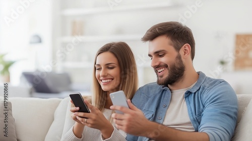 smiling couple sitting on sofa, man holding smartphone in his hands