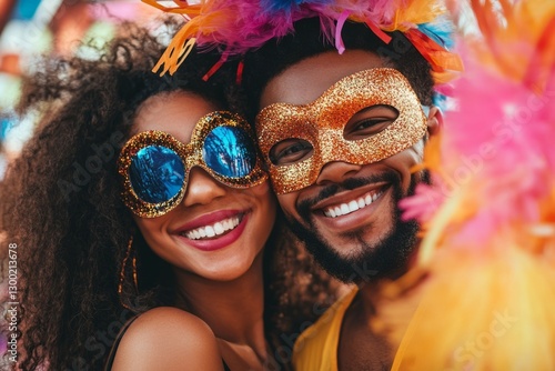Smiling couple wearing colorful costumes and masks celebrating at a vibrant carnival party