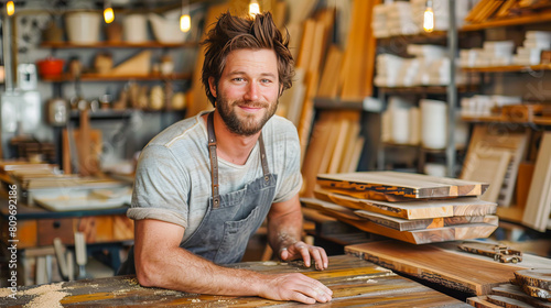 Smiling craftsman posing inside his woodworking shop, surrounded by handmade wooden items