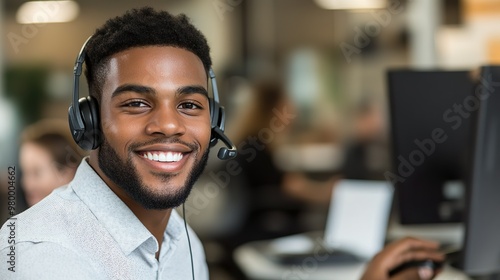 Smiling Customer Service Representative Using Headset to Help Clients