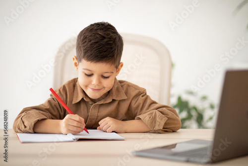 Smiling cute small european kid sitting at table studying, drawing with laptop, enjoy lesson at school