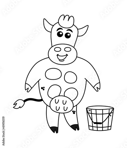 Smiling dairy cow with bucket full of fresh milk on white background for coloring - vector