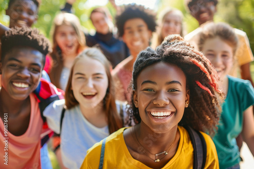 Smiling diverse group of teenagers in yellow, blue and red, joyful friendship, summer fun, back to school.