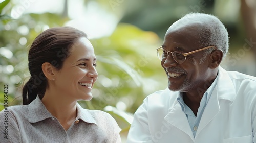 Smiling Doctor and Patient Sharing a Joyful Moment Outdoors, Capturing a Positive Interaction and Connection in a Natural Setting with Greenery in the Background
