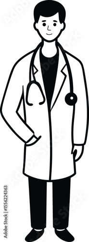 Smiling Doctor with Stethoscope Line Art, Male Medical Professional Outline Icon, Healthcare Practitioner Cartoon Character.