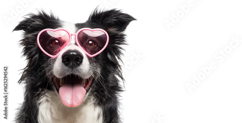 Smiling Dog Wearing Pink Heart Sunglasses Isolated on Transparent Background