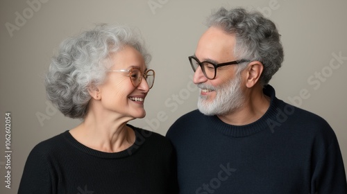 Smiling elderly couple enjoying each other's company in a cozy indoor setting during a relaxed moment of connection.