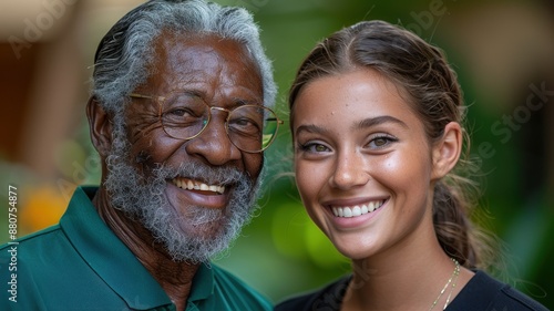 Smiling elderly man with white beard and young woman with brown hair, cheerful portrait outdoors with green background, family bonding.